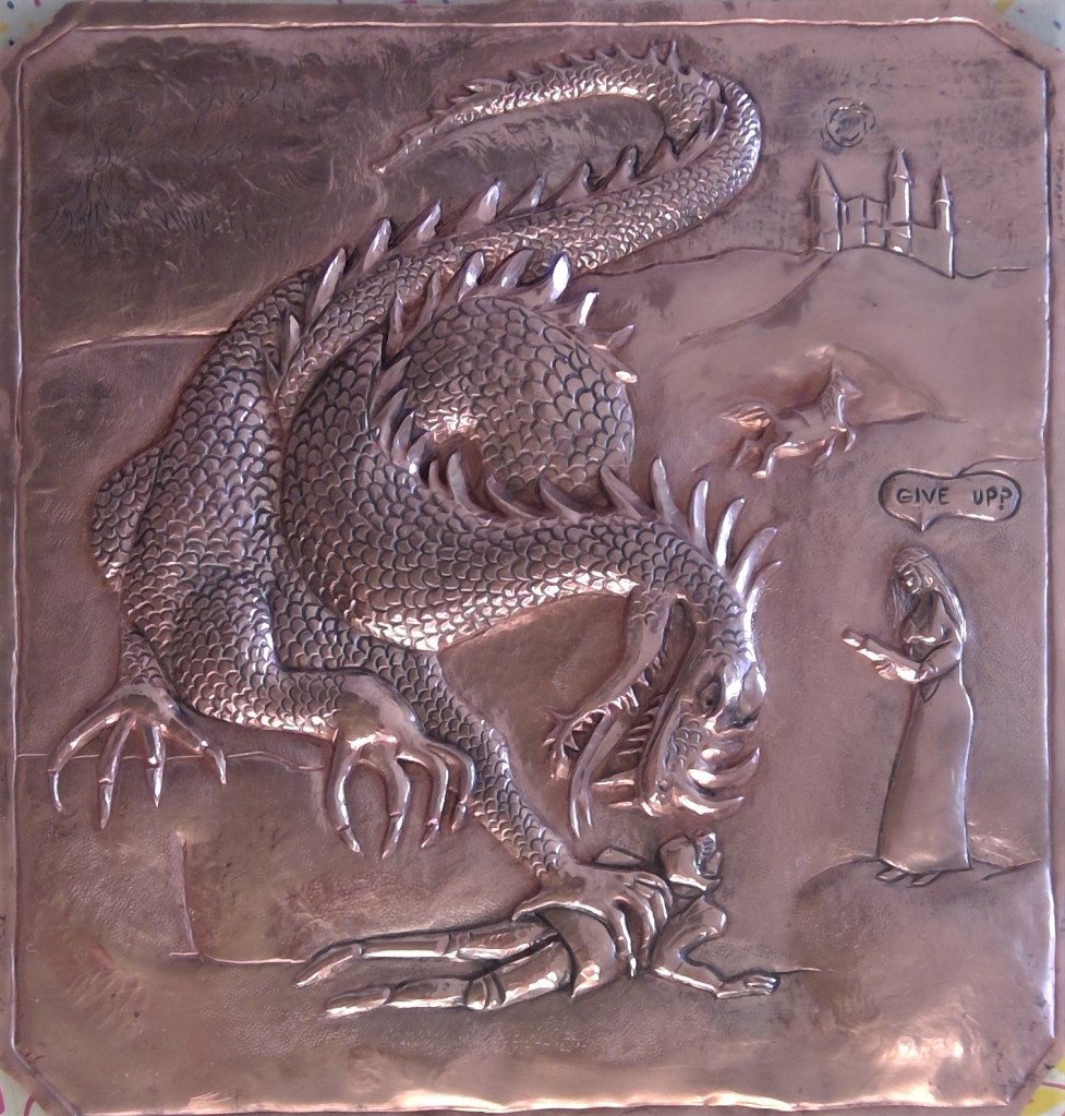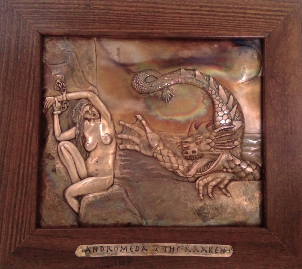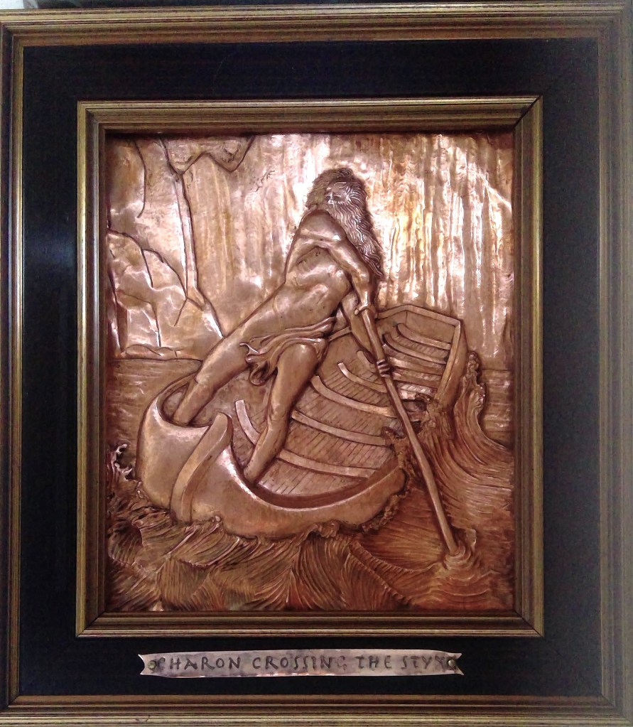 Chasing is the art of pushing metal with thousands of hammer taps against rounded punches (unlike engraving which removes metal), and repoussé is hammered from the back to raise the image in 3 dimensions. Each piece starts as chasing the lines of a drawing laid over a flat sheet of metal and then flipped over to push out the back to create relief. The piece is flipped over many times this way to raise, shape and smooth the picture or design. The hours involved are too numerous to count. The love of creation and working the metal melt time away as I work.